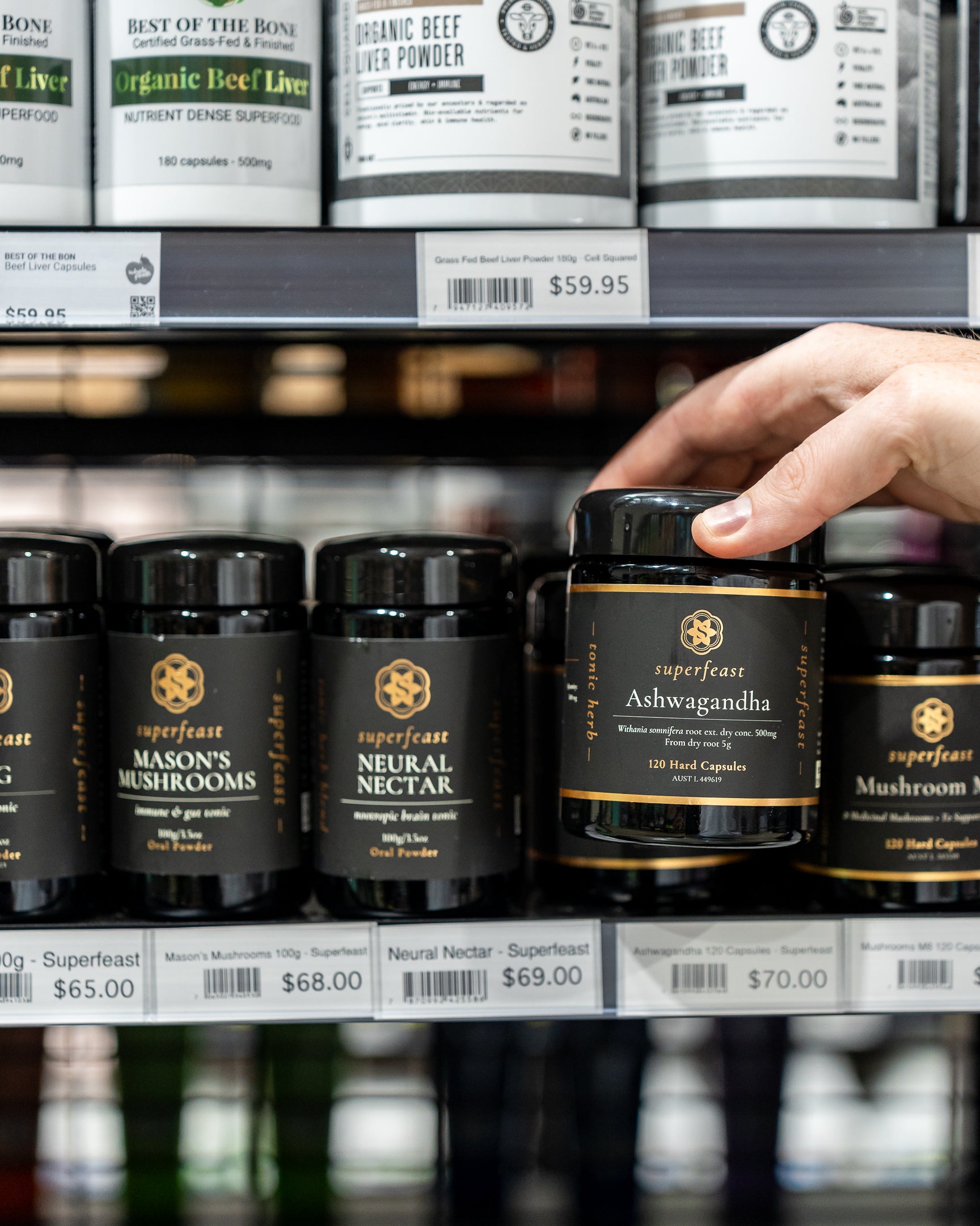 The Superfeast Ashwagandha capsules are packed with 10:1 extract powder (that’s 10kg of herb to 1kg of pure goodness!). They support reproductive hormones, promote healthy sleep, and help your body handle stress better. We took Ashwagandha while opening our Wodonga store, and we SWEAR by it!