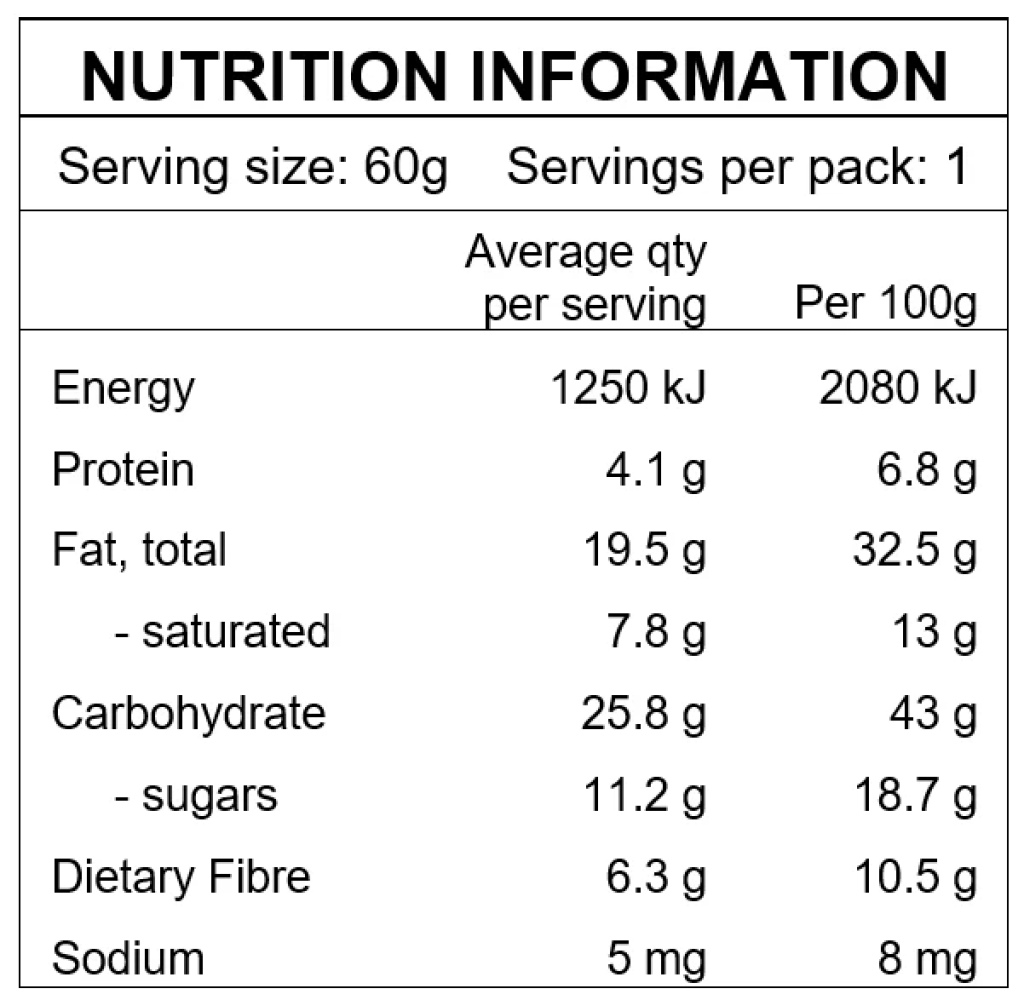 Ingredients: Dark Chocolate 58% (Cocoa Butter*, Raw Sugar*, Cocoa Mass*, Sunflower Lecithin*), HAZELNUT (26%), Brown Rice Flour*, Coconut Oil, Cassava Root Syrup, Coconut Sugar*, Chickpea Flour, Soluble Tapioca Fibre, Tapioca Flour, Natural Flavour, Sea Salt. *Organic ingredients