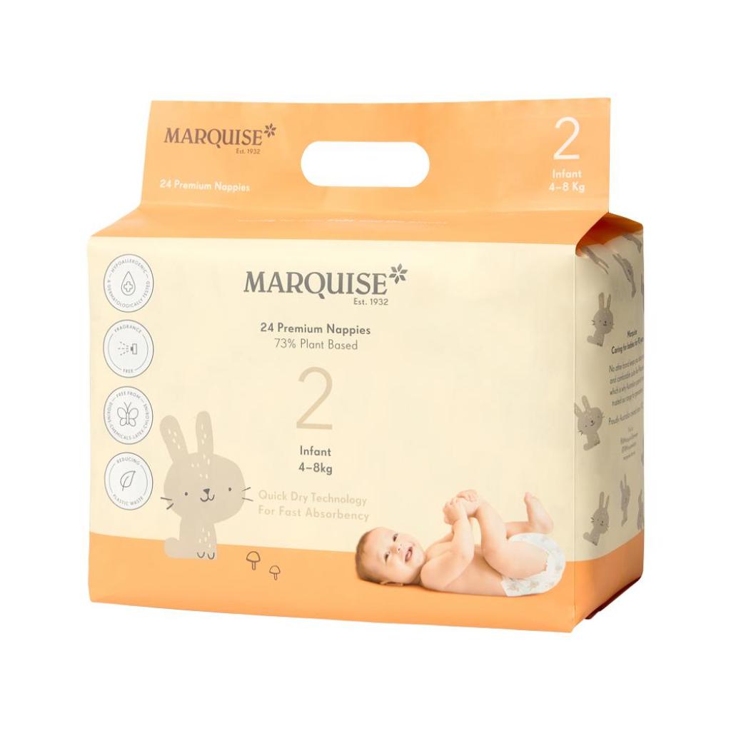 Marquise Hypoallergenic Nappies have you protected from messy leaks and blow-outs for 12 hours (hello full night's sleep!). They are chemical-free, dermatologically tested and made with 73% plant based materials.